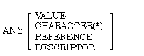 If you specify ANY for a parameter, you cannot specify any data-type attributes for that parameter except CHARACTER(*). If ANY is used by itself, the parameter is passed by reference. If ANY is used with VALUE, the parameter is passed by immediate value. If ANY is used with CHARACTER(*), the parameter is passed by character descriptor.